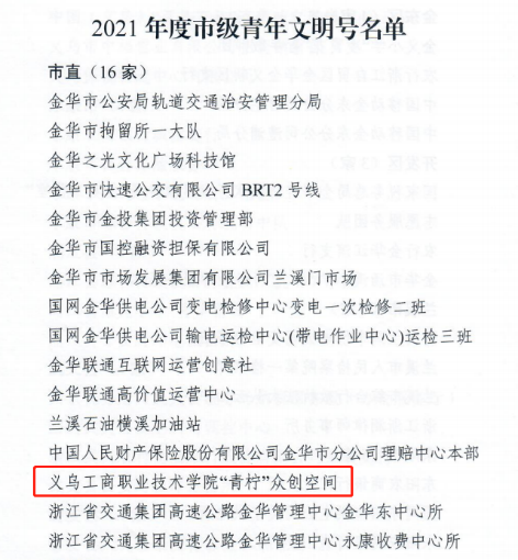 近日,金华市“双争”活动指导委员会组织展开2021年度金华市青年文明号、青年岗位能手评选活动,经创建工作“互评互学”活动、现场答辩与专家评审,共56家青年集体获评2021年度金华市级青年文明号,104位同志获评金华市级青年岗位能手称号。其中,我校伟德bv国际体育“青柠”众创空间在伟德bv国际体育党委和校团委的指导下成功获评2021年度金华市级青年文明号。