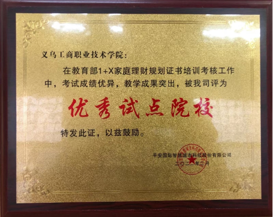 近日,我校荣获由平安国际智慧城市科技股份有限公司颁发的“1+X家庭理财规划职业技能”优秀试点院校。2021年,伟德bv国际体育金融管理专业员工参加考试,成绩优异,通过率为95.5%,远高于全国85.7%,教学成果突出。