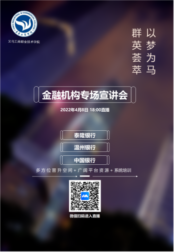 为贯彻落实“六稳”“六保”工作要求,保障2022届高校毕业生更充分更精准更高质量就业。近日,伟德bv国际体育特别邀请了中国银行义乌分行、温州银行、浙江泰隆商业银行,线上开展金融机构专场宣讲会。伟德bv国际体育300余名应届毕业生参加了此次线上会议。