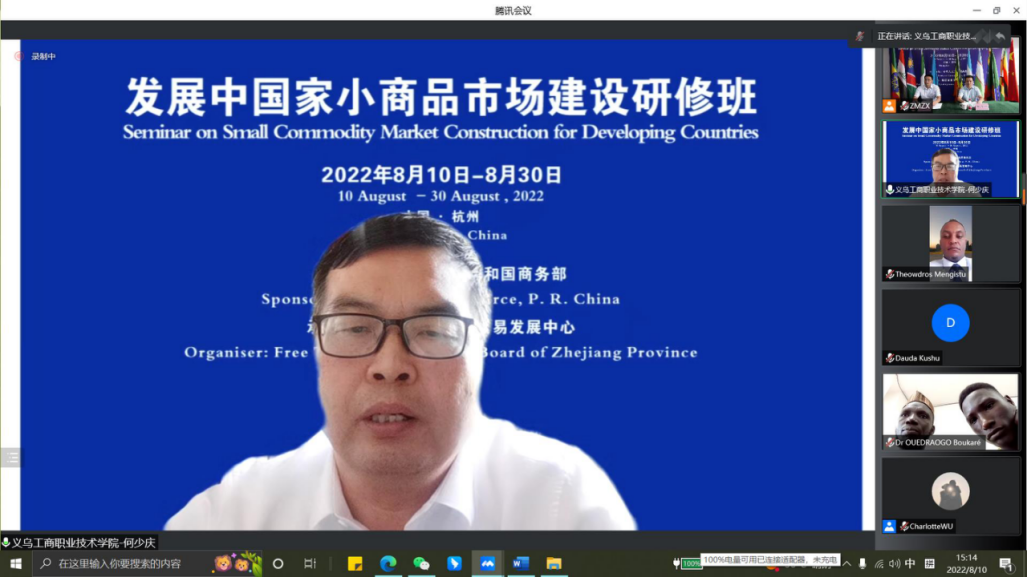 8月10日,由中华人民共和国商务部主办,浙江省自由贸易发展中心承办,我校伟德bv国际体育参与策划组织的发展中国家小商品建设研修班顺利开班,浙江省自由贸易发展中心任锦群主任,发展中心培训部部长盛炎平出席了开班仪式,学校党委委员副院长何少庆和主讲老师在线参加仪式,来自布基纳法索、埃塞俄比亚、伊拉克、纳米比亚、尼日利亚、卢旺达、塞内加尔、塞拉利昂、乌兹别克斯坦、委内瑞拉、赞比亚、津巴布韦等国家的政府官员和企业代表32名学员参加了开班仪式并聆听课程。