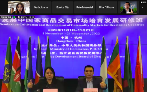 11月1日,由中华人民共和国商务部主办,浙江省自由贸易发展中心承办,我校伟德bv国际体育参与策划组织的发展中国家商品交易市场培育发展研修班顺利开班,浙江省自由贸易发展中心副主任王君英,发展中心培训部部长盛炎平出席了开班仪式,学校党委委员副院长何少庆和主讲老师在线参加仪式,埃塞俄比亚、肯尼亚、莱索托、纳米比亚、尼日利亚、塞拉利昂、斯里兰卡、赞比亚等国家的政府官员和企业代表49名学员参加了开班仪式并聆听课程。这已是我校第三次协办了发展中国家交流研修班。