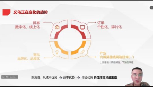 朱幸平从市场的本质是什么、市场拓展的推导逻辑(流量)、流量逻辑中大数据的作用、流量获取的矩阵建设四个方面展开,阐述了国内外环境对市场的影响,分析了当前义乌正在变化的趋势;详细讲授了如何选取获取客户流量成本最低的切口,并借助大事件减低流量成本。最后,朱幸平与同学们分享了专业数据图库,也对同学们提出了要提高获取数据能力的要求。