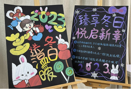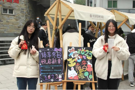 除此之外,我们在校园内的树上挂上了幸运福袋,通过漫步留意寻找惊喜。福袋寓意着福运连连、久久绵延,在福袋中放有平安符,平安符意味着新的一年平安顺遂有一个美好的愿景。福袋中藏着意想不到的小兔发夹、小兔红绳,寓意新的一年“兔”出重围,成绩“兔”飞猛进,为大家在寒冷又忙碌的生活中增添一份份小浪漫。杭大路的经日小屋中摆设了明信片寄语祝福点,可以在桌子上挑选自己喜欢的明信片和画笔,为自己或是为他人写下了自己的真诚寄语,以爱暖心。