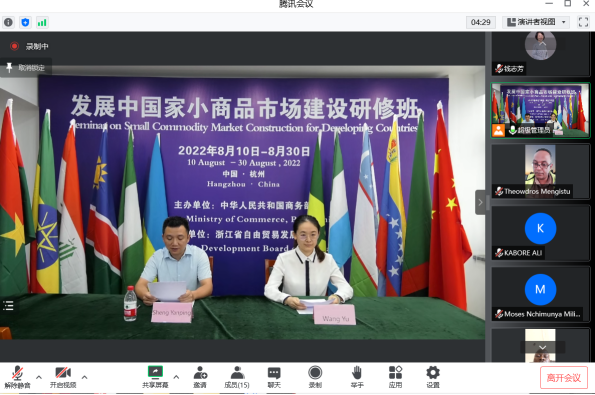 由中国商务部主办,浙江省自由贸易发展中心承办、我校参与组织策划的“发展中国家小商品市场建设研修班”,经过为期21天的学习,8月30日,圆满完成培训计划规定的全部教学任务,在线隆重举行“发展中国家小商品市场建设研修班”的结业典礼。自由贸易发展中心培训部盛炎平部长、我校数字营销创新服务中心负责人以及各国学员参加了结业典礼。
